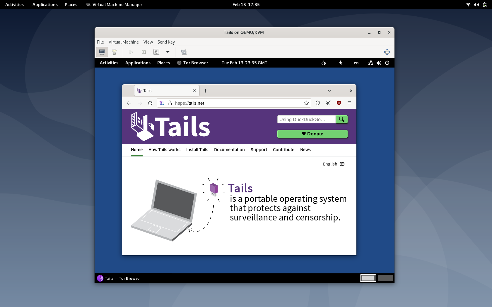 With virtual machines, it is possible to run Tails inside a host operating system. A virtual machine emulates a real computer and its operating system, called a guest, which appears in a window on the host operating system.