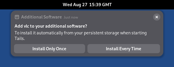 Если выбрать Install Every Time, пакет сохранится в Постоянном хранилище и будет автоматически переустанавливаться при каждом запуске Tails.